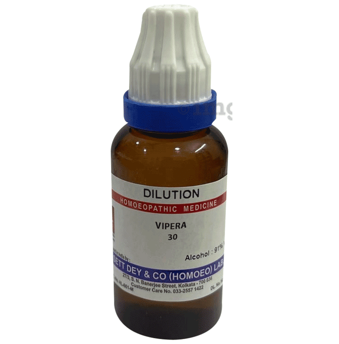 Sett Dey Vipera Dilution has been used in Homoeopathy for brain abscesses, tonsil stones, liver cirrhosis, asphyxia of newborns, malignant inflammation of the heart, gangrene, old ulcers that reopen, painful varicose veins, and periodical epileptic convulsions.
