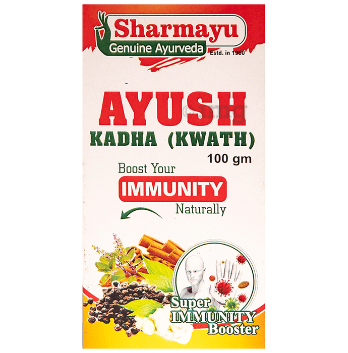 Sharmayu Ayush Kadha (Kwath) supports the bodys natural immunity and may help provide relief from soreness in the throat and symptoms associated with cold and cough.