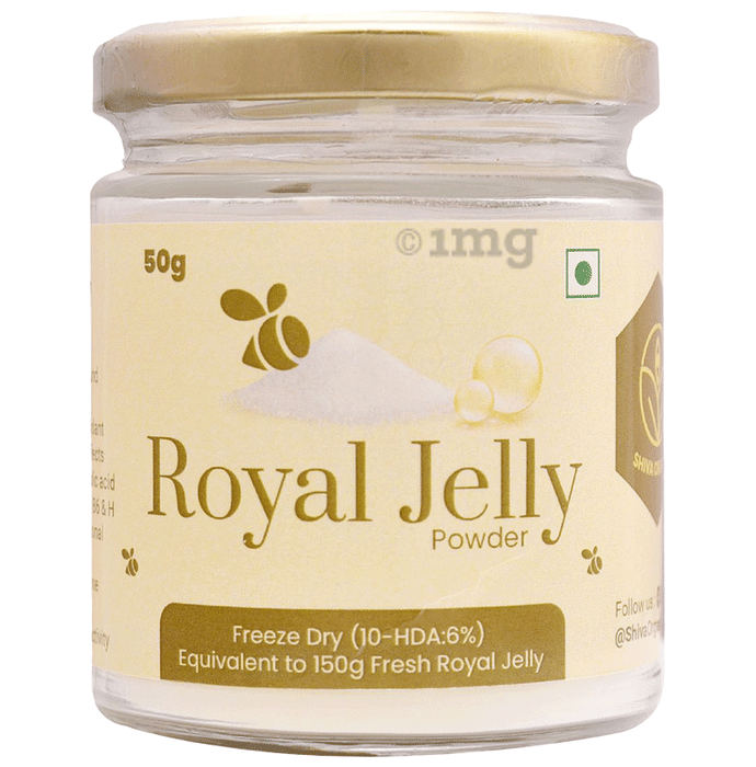 Shiva Organic Royal Jelly Powder contains powdered royal jelly (Lyophilised - freeze dried at -40°C) Storage capability of Royal jelly can be improved through the use of freeze drying. Fresh Royal jelly is susceptible to losing the bioactive compounds at room temperatures. Therefore fresh royal jelly has been freeze-dried at -40 C to remove the moisture content and to maintain maximum stability at room temperature. Fresh Royal jelly has about 65% moisture whereas freeze-dried Royal jelly powder contains only 5% moisture. After moisture reduction, Royal jelly becomes more concentrated form and the contents range is tripled. Rich in biotin, vitamin B7, vitamin E, and dietary fibre, it supports blood supply, cognition, liver detoxification, hormone health, and more. This pack contains 10 gm of dried and powdered royal jelly equivalent to 30 gm of fresh royal jelly.