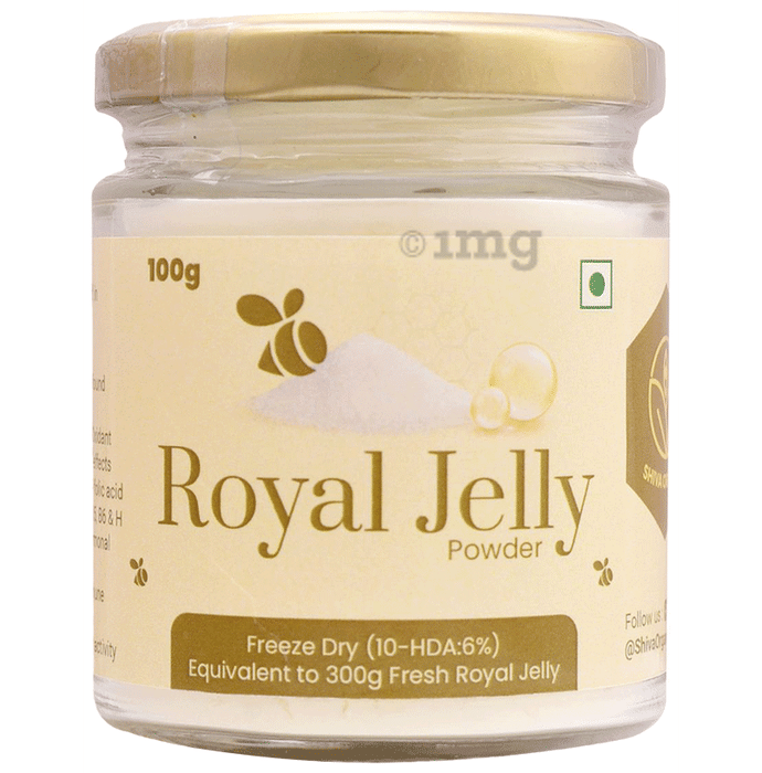 Shiva Organic Royal Jelly Powder contains powdered royal jelly (Lyophilised - freeze dried at -40Β°C) Storage capability of Royal jelly can be improved through the use of freeze drying. Fresh Royal jelly is susceptible to losing the bioactive compounds at room temperatures. Therefore fresh royal jelly has been freeze-dried at -40 C to remove the moisture content and to maintain maximum stability at room temperature. Fresh Royal jelly has about 65% moisture whereas freeze-dried Royal jelly powder contains only 5% moisture. After moisture reduction, Royal jelly becomes more concentrated form and the contents range is tripled. Rich in biotin, vitamin B7, vitamin E, and dietary fibre, it supports blood supply, cognition, liver detoxification, hormone health, and more. This pack contains 10 gm of dried and powdered royal jelly equivalent to 30 gm of fresh royal jelly.