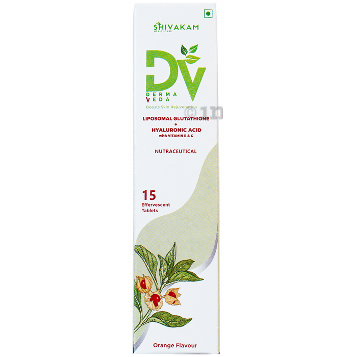 Shivakam Healthcare Derma Veda Effervescent Tablet Orange is a vegetarian dietary supplement combining liposomal glutathione, antioxidants, and botanical extracts. It dissolves quickly in water, offering a convenient way to support overall skin wellness. Suitable for daily use with an orange-flavoured fizzy format.