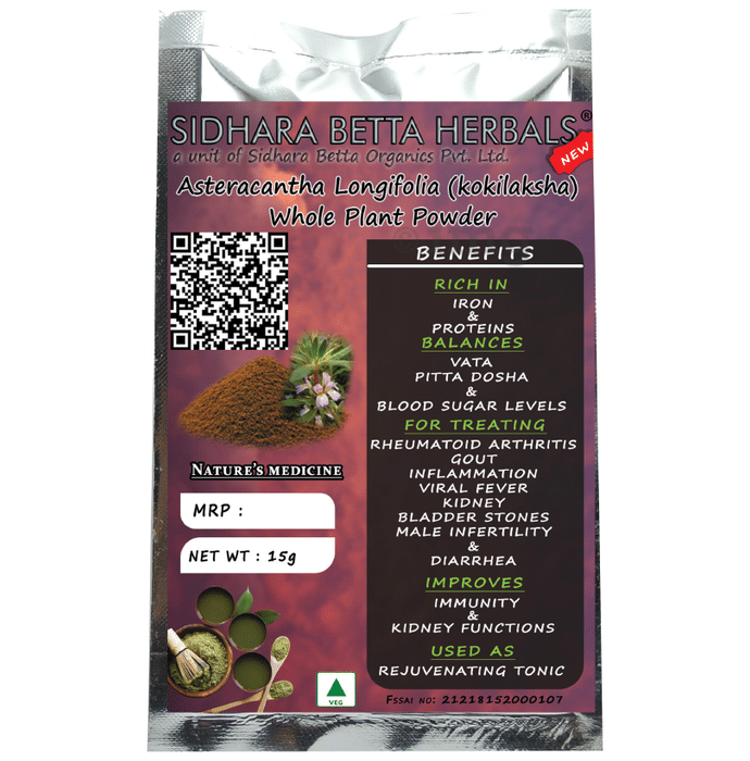 Sidhara Betta Herbals Asteracantha Longifolia (kokilaksha) Whole Plant Powder is a herbal formula rich in iron and proteins. It balances vata, pitta dosha and blood sugar levels. It improves immunity and kidney functions. It is used as a rejuvenating tonic.