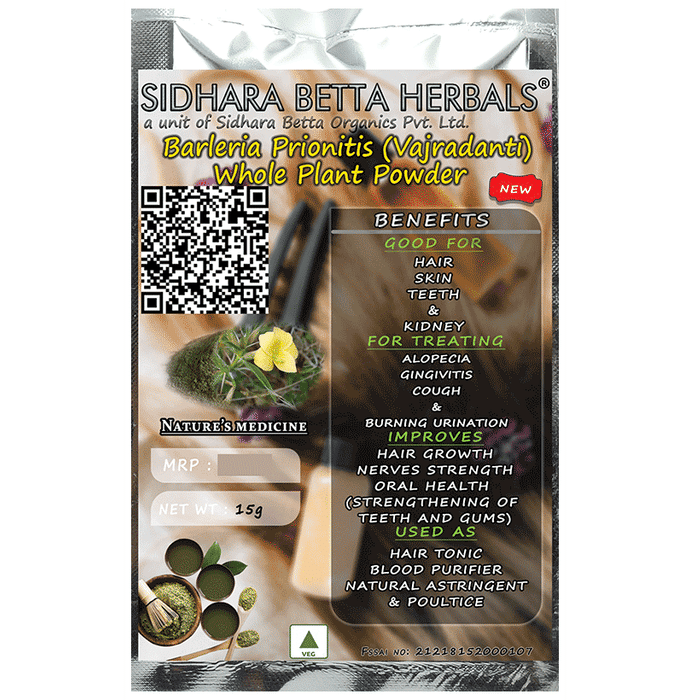 Sidhara Betta Herbals Barleria prionitis (Vajradanti) Whole Plant Powder is a herbal product that harnesses the power of Barleria prionitis, also known as Vajradanti, to promote oral health and hygiene. This product caters to minor symptoms of alopecia, gingivitis, cough, and burning urination,
