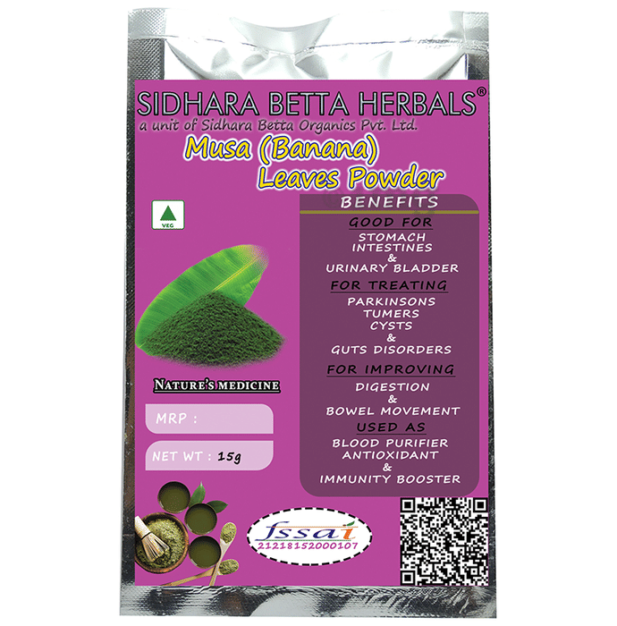 Sidhara Betta Herbals Musa Leaves Powder is a single herb formulation beneficial for the stomach, intestines and urinary bladder. It improves digestion and eases bowel movements. It helps manage Parkinson's disease, tumours, cysts and guts disorders. It acts as a blood purifier, antioxidant and immunity booster.
