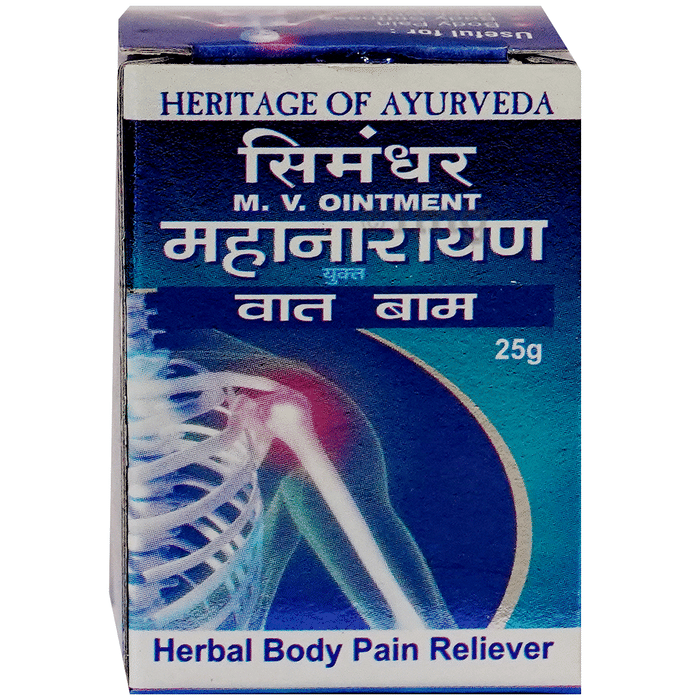 Simandhar M.V. Ointment (Mahanarayan Vaat Balm) is formulated to help support comfort in cases of localised discomfort and minor swelling associated with overexertion, physical stress, or routine activity. It can be used for concerns like sprains, strains, back stiffness, and general muscular unease. The formulation can also be applied for shoulder-related discomfort or neck and lower back tension and can be used as part of regular topical care routines.