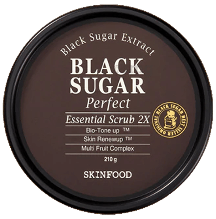 Skinfood Black Sugar Perfect Essential Scrub 2x is an exfoliating mask and scrub containing black sugar, rice wine, and fruit extracts that gently exfoliates skin for a brighter and smoother complexion. It features black sugar and rice wine to refine skin texture and promote blood circulation.