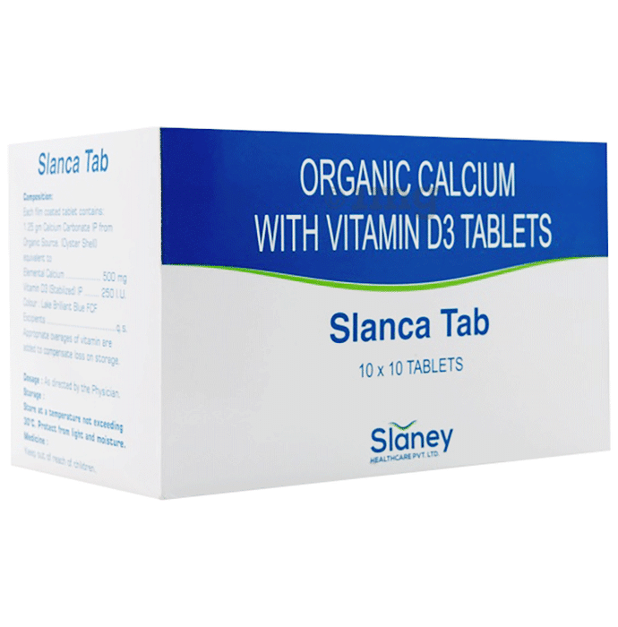 Slanca Tablet is a supplement that combines organic calcium sourced from oyster shells and Vitamin D3, designed to help maintain strong bones and teeth. The inclusion of Vitamin D3 may enhance calcium absorption, making it especially beneficial for elderly individuals, pregnant women, and breastfeeding mothers who require additional nutritional support. Each fin-coated tablet provides 1250 mg of calcium carbonate and 250 IU of Vitamin D3, potentially assisting bone health and overall wellness. Slanca Tab offers a reliable daily solution for those looking to supplement their diet with essential nutrients for bone maintenance.
