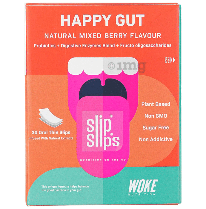 Slip Slip's Happy Gut Oral Thin Strip Natural Mixed Berry Slip Slips uses the power of nanotechnology to make living healthily easier. These quick-dissolving strips turn essential vitamins and herbs into nanoparticles that melt on your tongue for an enjoyable and fun way to absorb all their goodness. These oral strips are designed to make your gut healthy and happy so you get to live with ease. It helps in aiding digestion and maintaining gut Ph. It also increases breaks down complex foods and reduces bloating!
