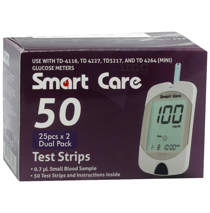 Smart Care Blood Glucose Test Strip (25 Each) are designed for accurate blood glucose measurement using just 0.7 μL of blood. Compatible with TD-4116, TD-4227, TD-3217, and TD-4264 (Mini) glucose meters, this dual pack includes 25 test strips each. Perfect for routine monitoring, these strips ensure reliable results with user-friendly instructions. Compact and convenient, they are a must-have for effective diabetes management.