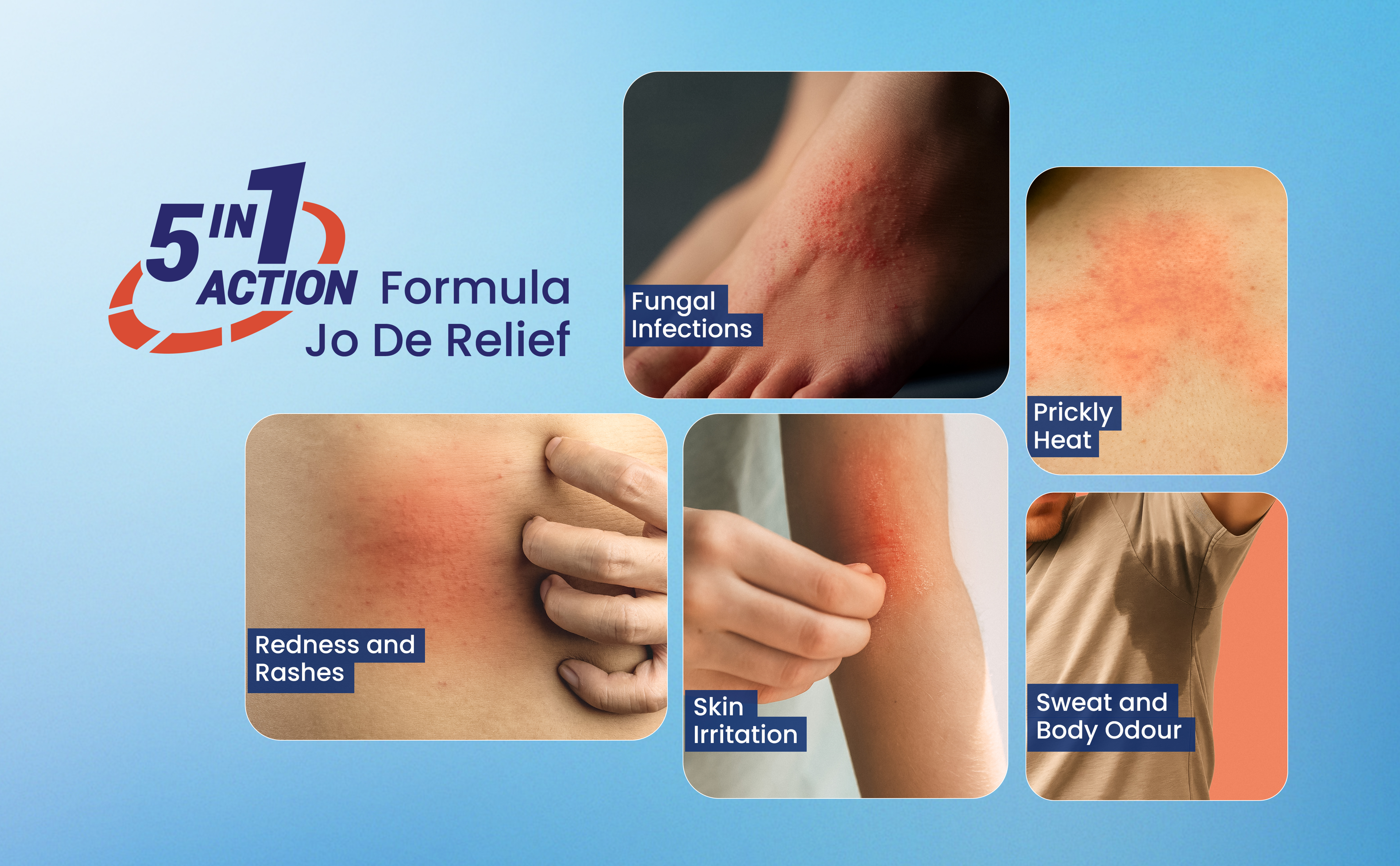 Redness, rashes, fungal infections, skin irritation, prickly heat, sweat, and body odour