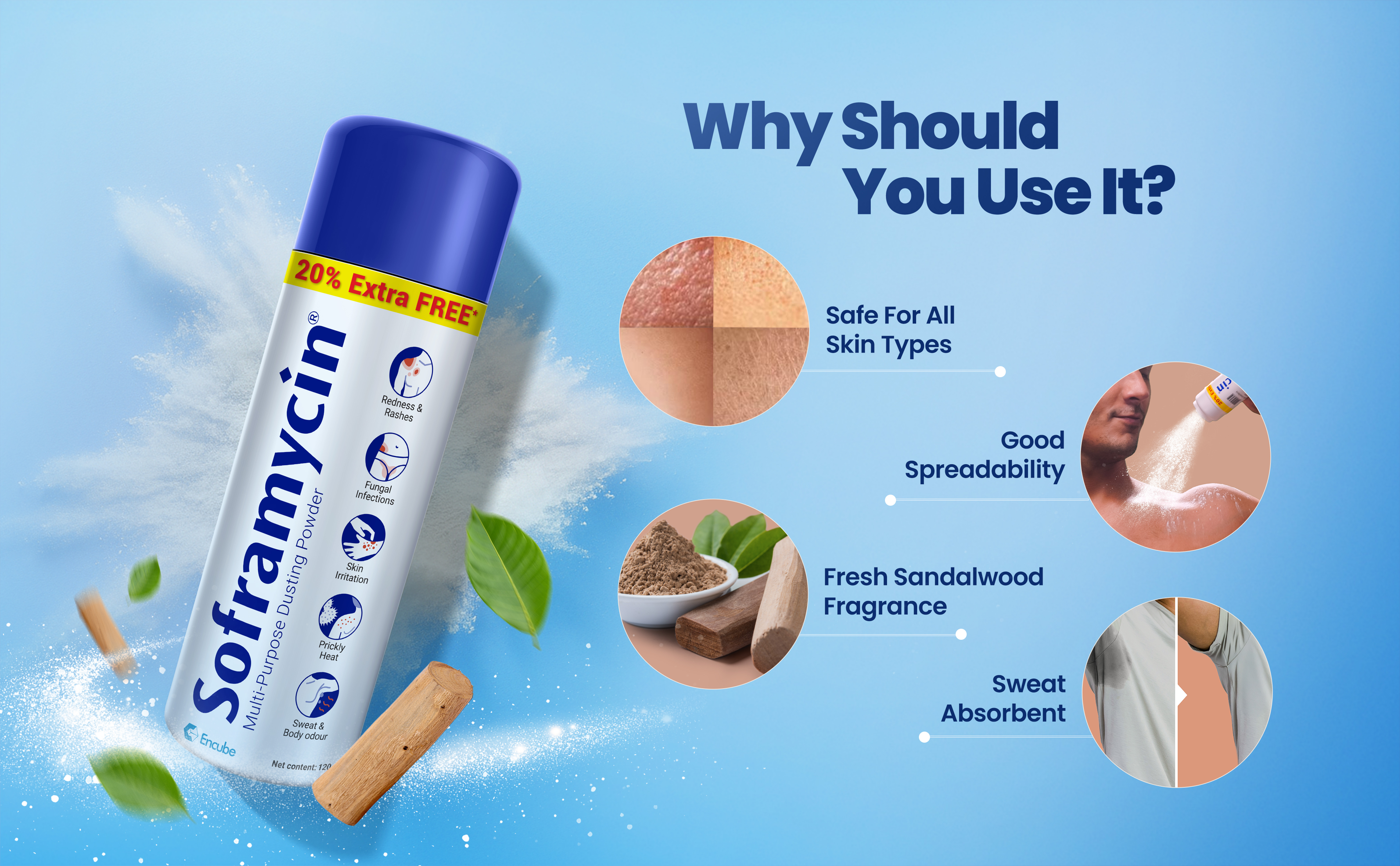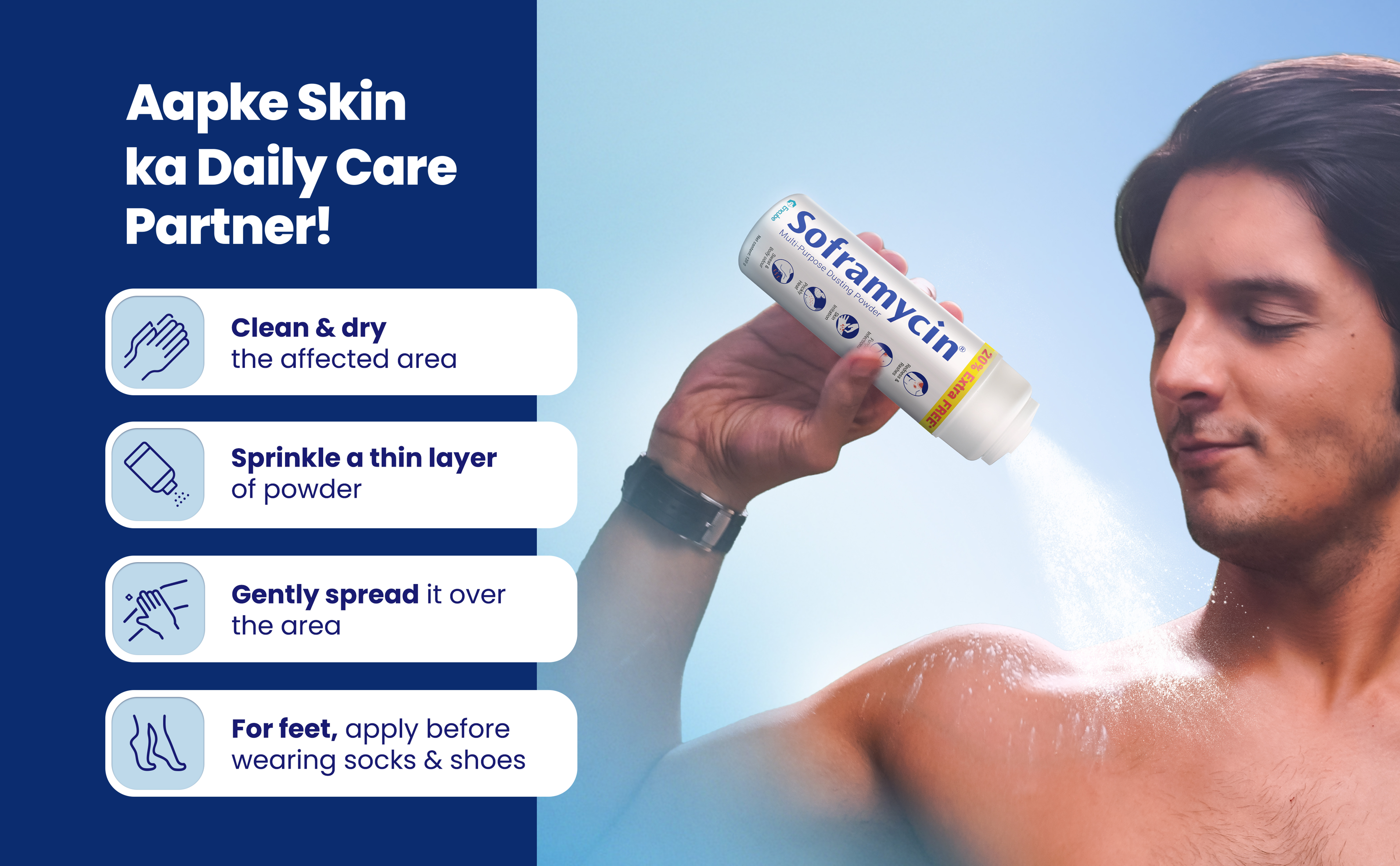 Soframycin Multi-Purpose Dusting Powder is a topical antifungal powder formulated to help manage a range of minor skin conditions. Containing Clotrimazole, it may provide relief from itching, irritation, and discomfort associated with fungal infections and other skin concerns. Suitable for daily use, it may also help absorb excess moisture, reduce odour, and support overall skin hygiene, especially in areas prone to sweating.