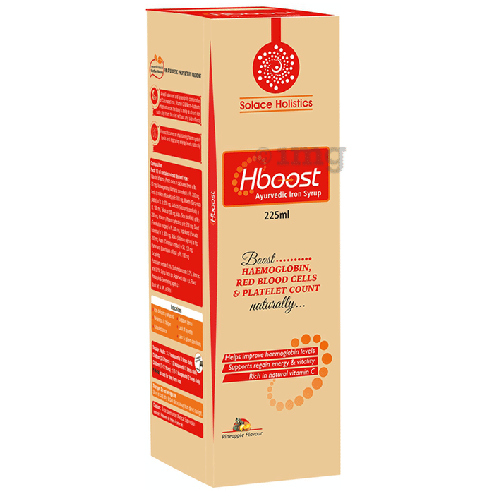Solace Holistics Hboost Ayurvedic Iron Syrup Hboost syrup is a high-potency ayurvedic formulation for anaemia, jaundice, iron deficiency and general weakness. Enriched with iron, calcium, essential amino acids, vitamins and minerals from natural resources it hel;ps boost platelet count significantly.
