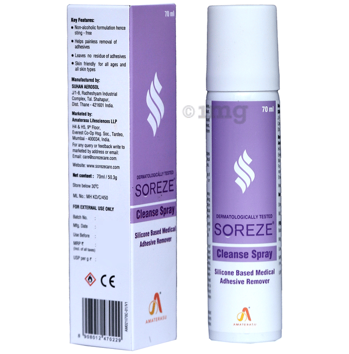 Soreze Cleanse Spray (70ml Each) is a silicone-based adhesive remover spray formulated to gently and effectively remove adhesives, dressings, and ostomy devices from the skin. It provides a smooth, sting-free experience without discomfort, making it suitable for sensitive areas. Unlike alcohol-based removers, it is free from alcohol, colour, fragrance, and preservatives, ensuring a gentle and skin-friendly application. It also helps clean adhesive residue without irritating or drying the skin.