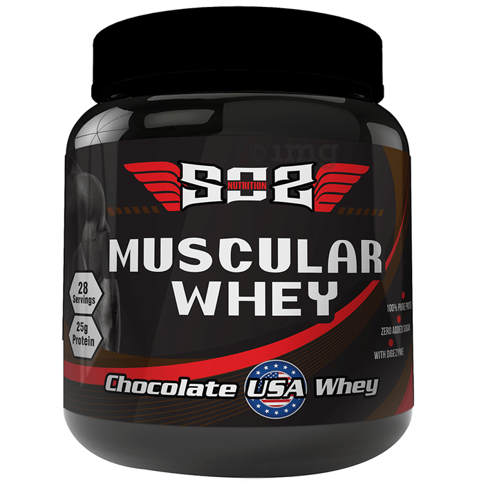 SOS Nutrition 100% Muscular USA Whey Protein Powder is a nutrient rich source of whey protein that promotes efficient lean muscle gains and slimming, making it a perfect choice for athletes and bodybuilders. It stimulates muscle recovery, and promotes muscle synthesis. It is loaded with vitamins and minerals to replenish the body's nutrients. It also provides 25 g of high performance protein. It does not carry sugars and makes for a perfect post-workout beverage.
