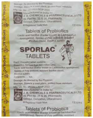 Sporlac Tablet is a probiotic supplement that contains beneficial bacteria to support gut health. It is designed to help maintain the balance of the natural microflora in your digestive system, especially when disrupted by factors such as dietary imbalances, antibiotic use, or digestive disturbances.