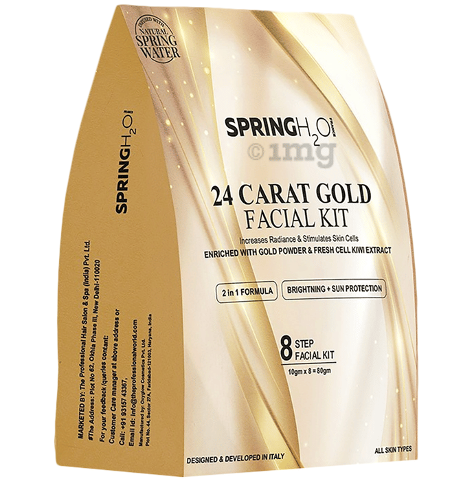 Spring H2O 24 Carat Gold Facial Kit is a powder and liquid-based skincare regimen designed for facial application. Supplied in eight sachets, the kit features key ingredients such as gold powder and fresh cell kiwi extract. This comprehensive kit offers a stepwise treatment that may help address multiple skin concerns, including uneven complexion and texture, signs of ageing, dullness, and tiredness. The kit is suitable for all skin types and provides a holistic facial care routine incorporating deep cleansing, exfoliation, massage, soothing, moisturisation, serum application, D-TAN treatment, and sun protection. The kit can help provide radiant, smooth, and revitalised skin with regular use.