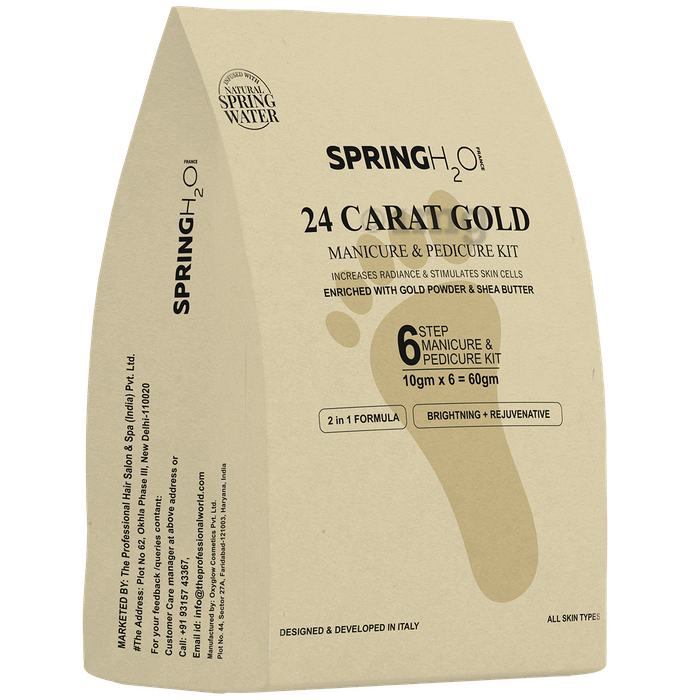 Spring H2O 24 Carat Gold Manicure & Pedicure Kit is a powder-based grooming kit designed for the care of hands and feet. The formulation includes Epsom salt, gold powder, and shea butter among its key ingredients, with additional components listed on the product label. This kit provides a step-by-step regimen including soaking, cleansing, exfoliation, massage, whitening, and callus care treatments. It may support the appearance of skin by helping address uneven texture, dullness, and impurities, making it suitable for all skin types. The comprehensive treatment routine can help maintain radiant, smooth, and healthy skin on hands and feet.