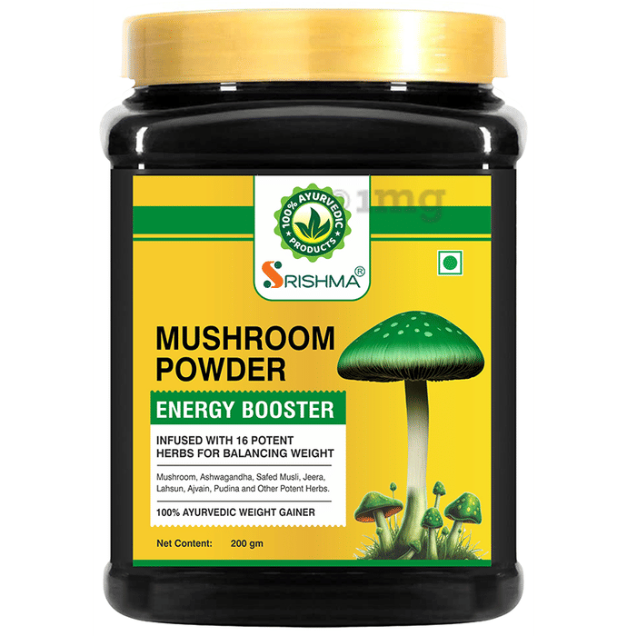 Srishma Mushroom Powder is an Ayurvedic proprietary blend designed to support weight gain and overall wellness. Infused with 16 potent herbs, including Ashwagandha, Safed Musli, and Gokshura, this powder may help increase appetite and boost metabolism. It is rich in essential proteins, folic acid, vitamins, and minerals, which may help in muscle recovery and improve energy levels. The product is ideal for both men and women, supporting immunity, heart health, and overall vitality. Suitable for daily consumption, Srishma Mushroom Powder is a natural solution for managing healthy weight without chemicals or side effects.