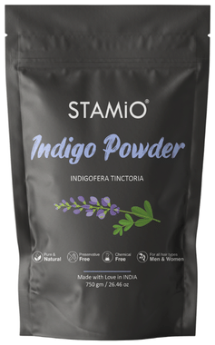 Stamio Indigo Powder is 100% natural, unadulterated, triple-sifted, micro-fine powder obtained by drying the fresh leaves of indigo. Unlike chemical-based hair dyes, which have ammonia in them that damage the hair shaft making the hair dry and brittle. The magical herb leaves a blue shade. When used with a base coat of henna, it also leaves a tinge of brown to black shade. Indigo Leaf Powder must be tried with natural henna for better results. It also helps to detangle hair, making them thicker, manageable and lustrous.