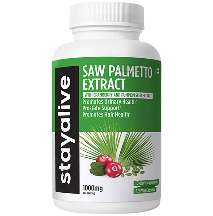 Stayalive Saw Palmetto Extract Veg Capsule combines nature's potential for helping support prostate health, urinary function, and overall well-being. This unique blend features Saw Palmetto (45% fatty acids), complemented by Cranberry and Pumpkin Seed extracts, traditionally valued for their wellness properties. These capsules can offer a convenient addition to daily routines, formulated for individuals seeking balanced support for prostate and urinary health.