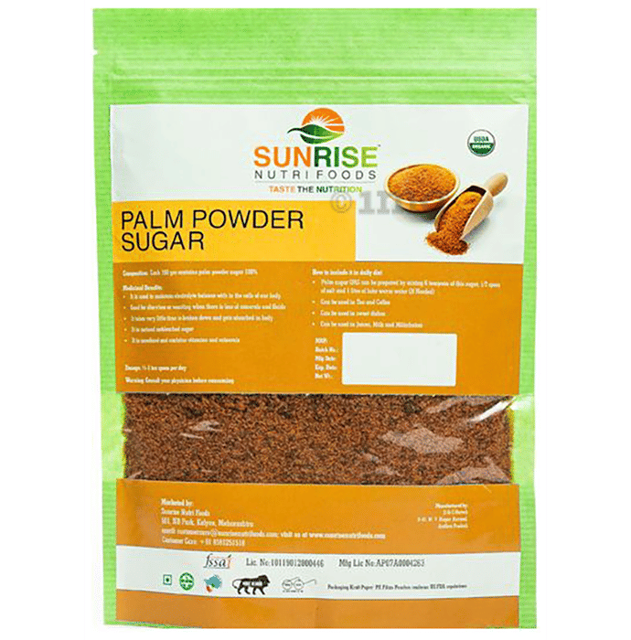 Sunrise Nutri Foods Palm Powder Sugar is an organic and US-DA certified product. It has a low glycemic index, works as a natural sweetener, and is a very good alternative for white sulphur containing sugar. The product is very good for kids, elders and diabetes patients. It is unrefined and contains vitamins and minerals.