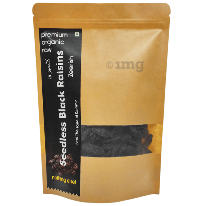 Superley Premium Organic Raw Seedless Black Raisins Zeerish are organic, seedless raisins sourced from Kashmir. These naturally sweet raisins are rich in antioxidants and dietary fibre, making them a nutritious addition to your diet. They can be enjoyed as a snack, soaked overnight, or added to a variety of dishes.