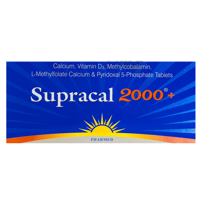 Supracal 2000 + Tablet is a comprehensive health supplement formulated with Calcium, Vitamin D3, and essential B-vitamins to support bone and nerve health. The inclusion of Vitamin D3 facilitates efficient calcium absorption for maintaining bone density, while Methylcobalamin, L-Methylfolate, and Pyridoxal 5-Phosphate support neurological function and metabolic processes. This combination helps in maintaining skeletal strength and systemic vitality, making it suitable for managing nutritional deficiencies related to bone and nerve wellness.