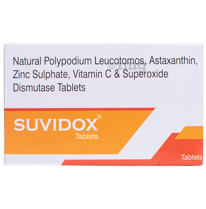 Suvidox Tablet contains polypodium leucotomos, a tropical fern rich in antioxidants. It provides comprehensive protection to the body's vital cells and promotes overall well-being. It is enriched with natural ingredients, astaxanthin, zinc sulphate, vitamin C, and superoxide dismutase. The synergistic blend of natural ingredients that shields the cells, enhances vitality and supports overall health.
