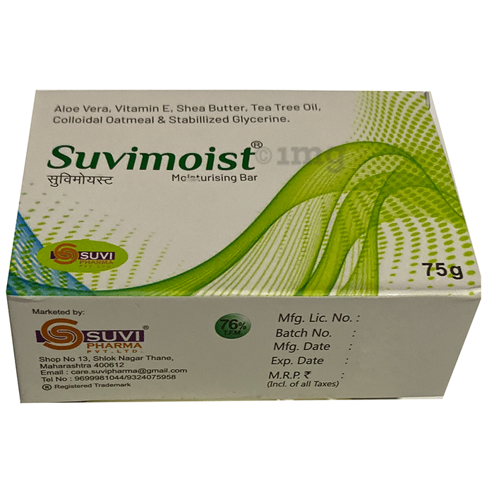 Suvimoist Moisturising Baris a moisturising herbal soap formulation enriched with aloe vera and shea butter suitable for all skin types. The soap adds a smoothening effect to the skin. It helps maintain the skin's moisture level, thereby keeping it hydrated