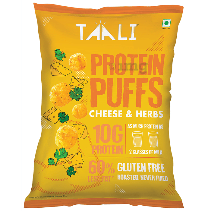 Taali Protein Puffs Cheese and Herbs is a high-protein snack delivering 10g of protein per serving, equivalent to the protein found in two glasses of milk. Made from a combination of wholesome ingredients such as Jowar, Chickpeas, and Lentils, this snack is roasted, gluten-free, and low in fat content. It can help offer a healthier snacking alternative for all ages.
