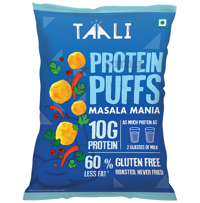 Taali Protein Puff Blend (Jowar, Chickpeas, Daal, Rice, Soy Protein Isolate), Masala Seasoning (Spices and Condiments [Onion, Chilli, Coriander, Garlic, Cumin], Corn Starch, Iodised Salt, Sugar, Black Salt, Dehydrated Mango Powder, Yeast Extract Powder, Acidity Regulator [INS 330]), Edible Vegetable Oil, Added Flavours (Natural and Nature Identical)