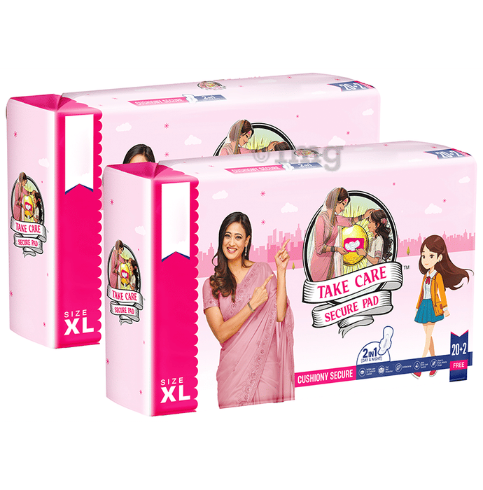 Take Care Cushiony Secure Sanitary Pads is a 2 in 1 day and night sanitary pad for light-heavy flow. These pads can give protection from stains without rashes or irritation. The bubble weave technology ensures ultimate Cushiony comfort all day long. Its hourglass shape, strong glue base and wings help the pad remain glued in place for an active day and comfortable sleep. The soft, cushiony cover makes for a comfortable experience all day long. It has four-wall protection and is gentle on the skin. Take Care Secure Pad has a soft edge arm and may reduce bad odour.