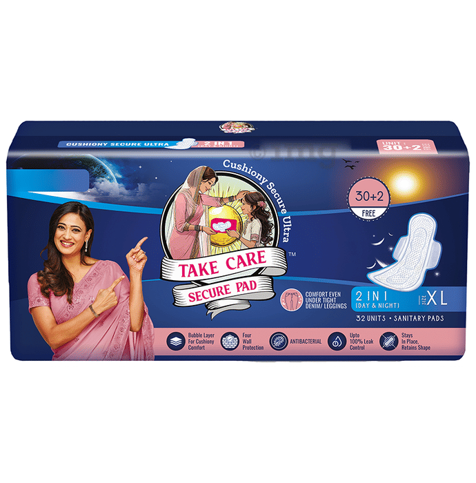 Take Care Ultra Cushiony Secure Sanitary Pad is a 2 in 1 day and night sanitary pad for light-heavy flow. These pads can give protection from stains without rashes or irritation. The bubble weave technology ensures ultimate cushiony comfort all day long. Its hourglass shape, strong glue base and wings help the pad remain glued in place for an active day and comfortable sleep. The soft, cushiony cover makes for a comfortable experience all day long. It has four-wall protection and is gentle on the skin. Take Care Secure Pad has a soft edge arm and may reduce bad odour. These pads are comfortable under tight, denim or leggings.