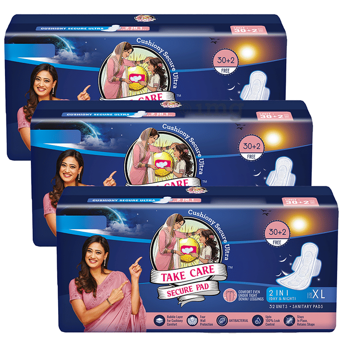 Take Care Ultra Cushiony Secure Sanitary Pad is a 2 in 1 day and night sanitary pad for light-heavy flow. These pads can give protection from stains without rashes or irritation. The bubble weave technology ensures ultimate cushiony comfort all day long. Its hourglass shape, strong glue base and wings help the pad remain glued in place for an active day and comfortable sleep. The soft, cushiony cover makes for a comfortable experience all day long. It has four-wall protection and is gentle on the skin. Take Care Secure Pad has a soft edge arm and may reduce bad odour. These pads are comfortable under tight, denim or leggings.
