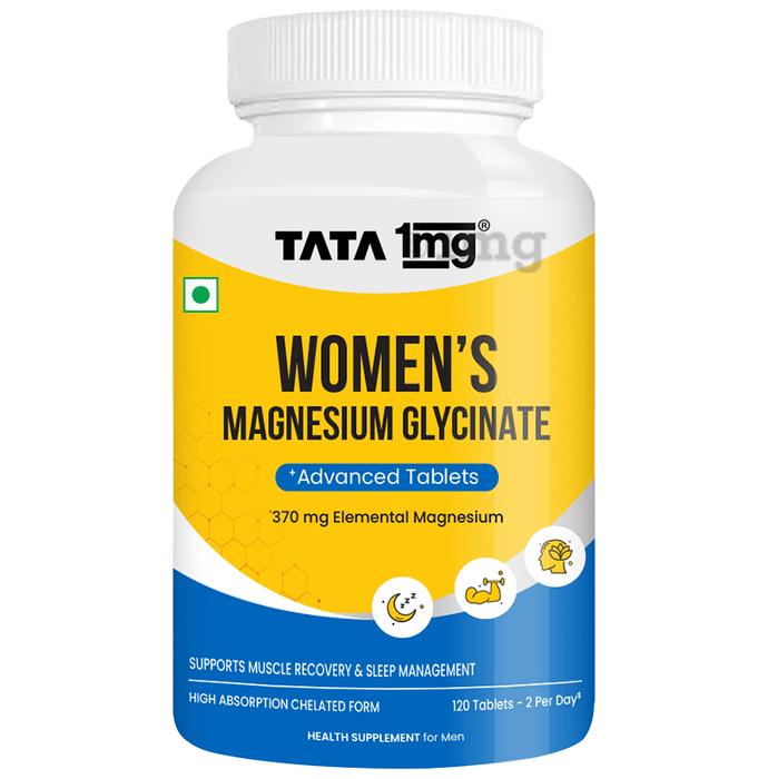 Tata 1mg Women's Magnesium Glycinate Advanced Tablet is formulated to provide 370 mg of elemental magnesium per serving in a chelated form that can support muscle recovery, sleep regulation, and overall wellness. The supplement combines magnesium bisglycinate buffered with magnesium hydroxide to help improve absorption and bioavailability. The combination can help maintain electrolyte balance and support normal energy metabolism. These tablets are designed to offer a convenient way to supplement daily magnesium requirements for women.