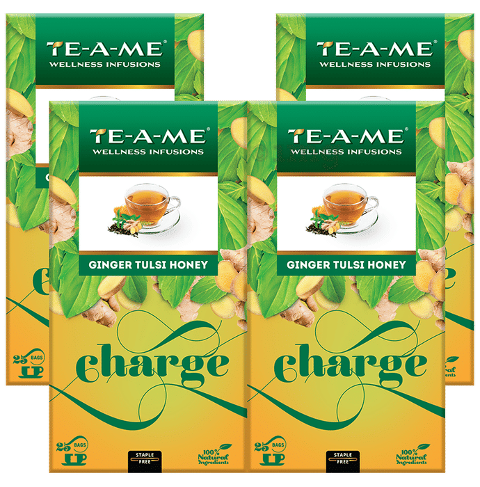 TE-A-ME Charge Ginger Tulsi Honey Unleash the power of Tulsi (Holy Basil), revered for over 5000 years. The phytonutrients and antioxidants in tulsi dry leaves enhance immunity, metabolism, and overall well-being in this herbal tea without caffeine. It can help alleviate common cold and cough symptoms, and joint pains, and support healthy ageing with the holistic benefits of this non-caffeine tea infusion.