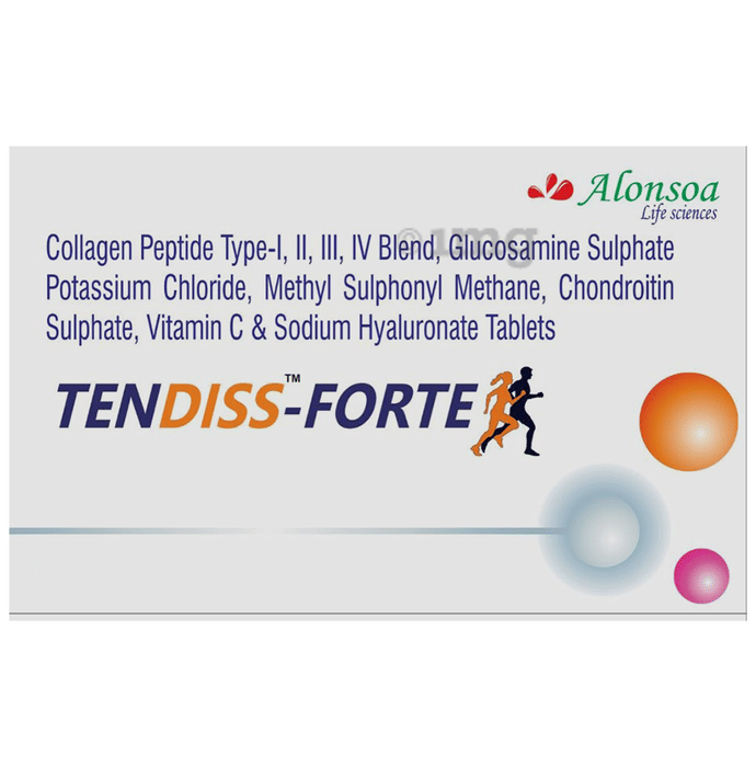 Tendiss-Forte Tablet is a nutraceutical supplement formulated with glucosamine sulphate, collagen peptides, MSM, chondroitin sulphate, sodium hyaluronate, and vitamin C. It may help contribute to joint comfort, flexibility, and connective tissue support as part of daily nutrition.