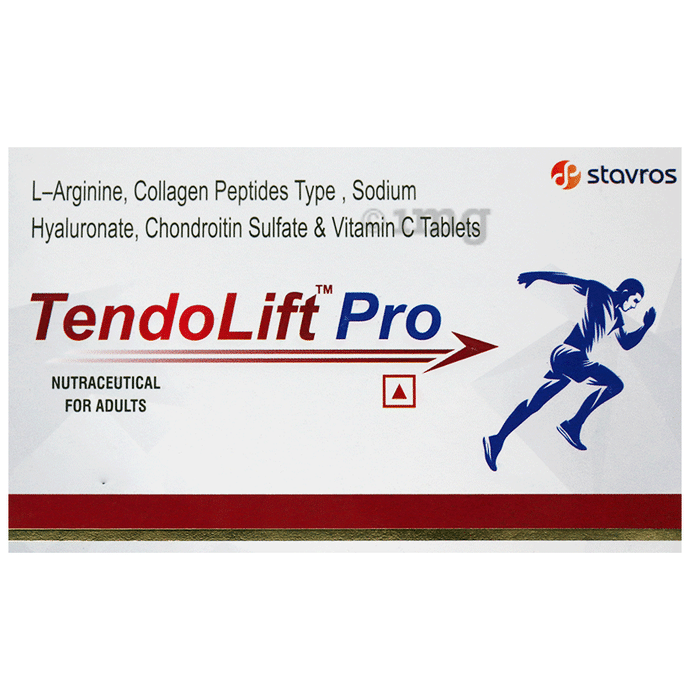 TendoLift Pro is a bilayered nutraceutical tablet formulated for adults. Each tablet contains L-Arginine (500 mg), Chondroitin Sulphate Sodium (200 mg), Collagen Peptides Type I (40 mg), Sodium Hyaluronate (10 mg), and Vitamin C (12.5 mg). These ingredients are provided in a sustained and regular release form within a single tablet to support daily nutritional requirements. The formula includes permitted synthetic colours and is intended for use as per the advice of a healthcare practitioner. It is not intended for medicinal use or for diagnosis, treatment, or prevention of any disease. The product is best suited for adult wellbeing when used in conjunction with a balanced diet.