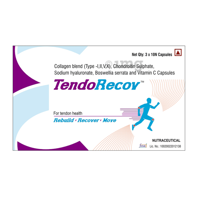 TendoRecov Tablet is a nutraceutical formulation containing collagen blend (Type I, II, V, X), chondroitin sulphate, sodium hyaluronate, boswellia serrata extract, and vitamin C. It is designed to help provide nutritional support for joint health and may help maintain overall well-being. The formulation consists of active ingredients that may help support joint structure, flexibility, and mobility.