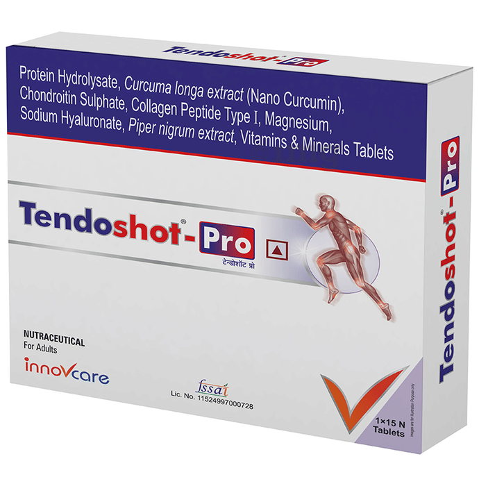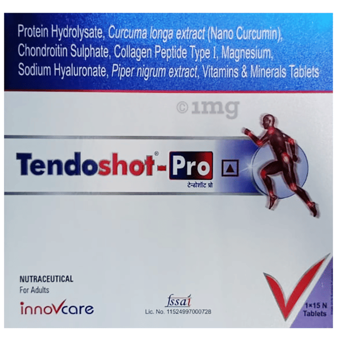 Tendoshot-Pro Tablet is a dietary supplement formulated to help support the health and recovery of tendons, ligaments, and joints. This blend combines Protein Hydrolysate, Nano Curcumin, Chondroitin Sulfate, and Collagen Peptide Type I that can help aid tissue repair, manage inflammation, and improve flexibility. Enriched with Sodium Hyaluronate, Magnesium, and Vitamin C, it can help facilitate collagen synthesis, joint lubrication, and muscle relaxation. The formula is further fortified with essential micronutrients such as Zinc, Manganese, Vitamins B6, B12, and D3, as well as Bioperine, which may help aid nutrient absorption.