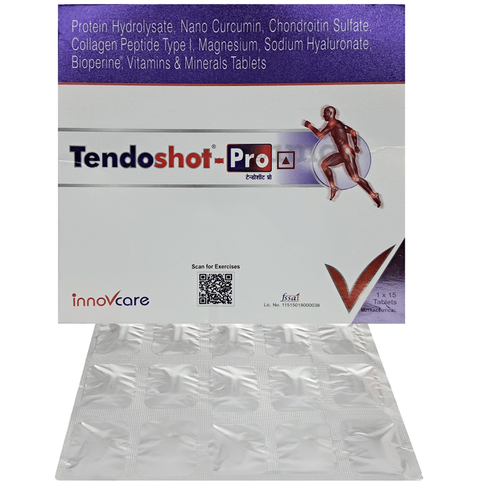 Tendoshot-Pro Tablet is a dietary supplement formulated to help support the health and recovery of tendons, ligaments, and joints. This blend combines Protein Hydrolysate, Nano Curcumin, Chondroitin Sulfate, and Collagen Peptide Type I that can help aid tissue repair, manage inflammation, and improve flexibility. Enriched with Sodium Hyaluronate, Magnesium, and Vitamin C, it can help facilitate collagen synthesis, joint lubrication, and muscle relaxation. The formula is further fortified with essential micronutrients such as Zinc, Manganese, Vitamins B6, B12, and D3, as well as Bioperine, which may help aid nutrient absorption.