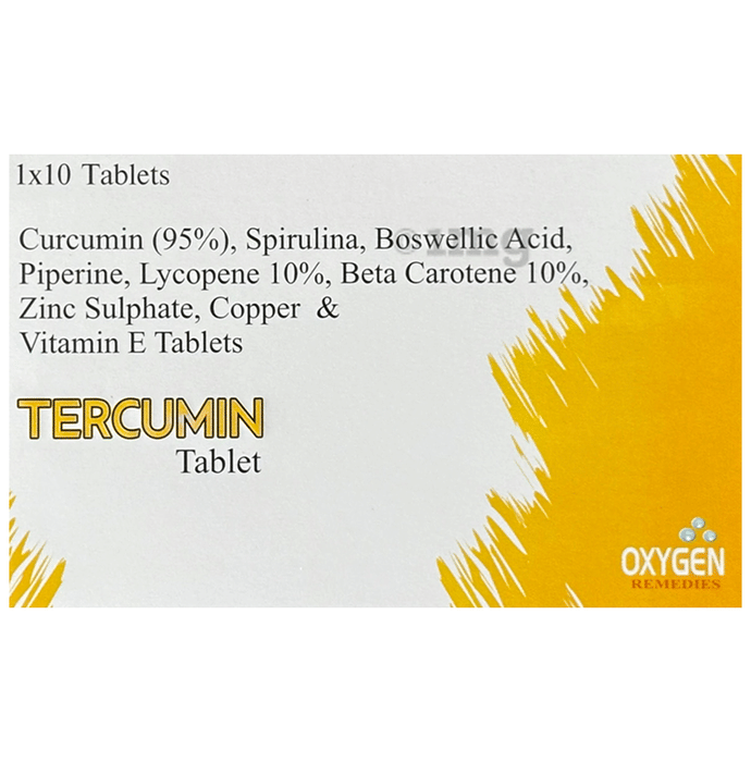 Tercumin Tablet is a dietary supplement formulated with a blend of botanical extracts, minerals, and vitamins that can support general wellness and vitality. It contains high-strength curcumin, spirulina, boswellic acid, piperine, lycopene, beta carotene, zinc, copper, and vitamin E. These ingredients together can help support antioxidant protection, nutritional balance, and overall physiological wellness. The formulation is designed to complement daily nutrition and can be a supportive addition to wellness-focused routines.