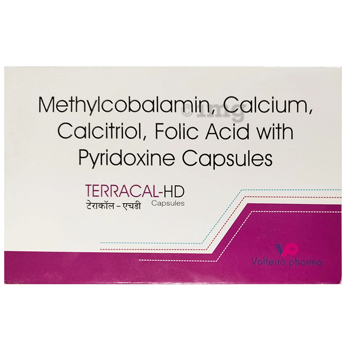 Terracal HD Capsule is a multivitamin tablet containing the benefits of calcium citrate, methylcobalamin, folic acid, and other essential nutrients. It helps strengthen the bones and joints. It also promotes the production and growth of blood cells and might help fight nervous ailments.