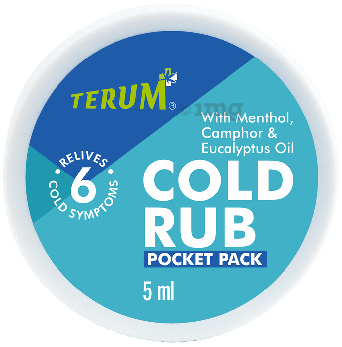 Terum Cold Rub Pocket Pack is a topical formulation enriched with natural actives like Menthol, Camphor, and Eucalyptus Oil. It is designed for external application to the chest, throat, and back to provide comfort from cough and cold-related symptoms. The soothing vapours may assist in easing nasal congestion, supporting easier breathing, and providing relief from muscular stiffness when used as directed.