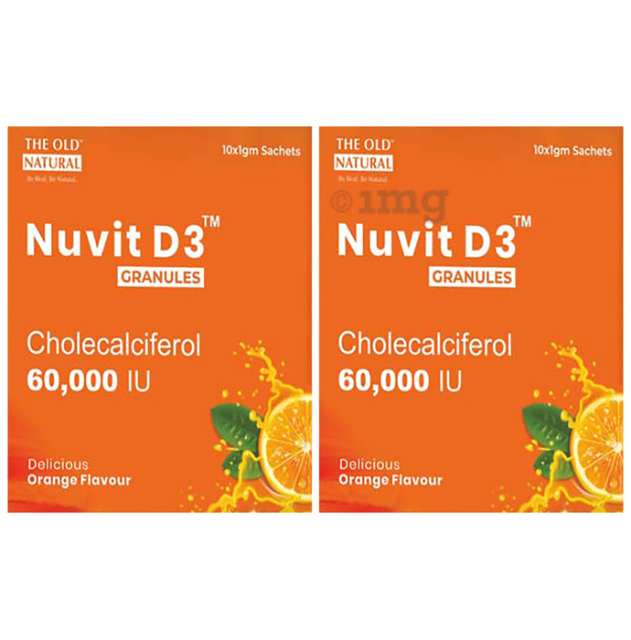 The Old Natural Nuvit D3 Granules Cholecalciferol 60,000 IU Sachet is a high-potency formulation containing 60,000 IU of Vitamin D3 (Cholecalciferol) that may help support bone and joint wellness. It is designed to support bioavailability and absorption in the body. It may help maintain bone structure, assist in calcium metabolism, and provide support in cases of low energy or muscle discomfort associated with nutritional gaps. The formulation can also help support joint cartilage health and normal cellular function.