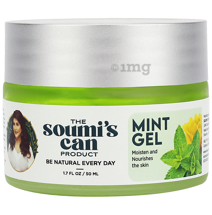 The Soumi's Can Product Mint Gel is a skincare solution enriched with mint extract, licorice root, and aloe vera. This lightweight gel is designed to help manage sebum secretion, hydrate the skin, and may help with acne breakouts. It may provide a soothing and cooling effect while potentially rejuvenating and brightening the complexion. Suitable for use after Active Face Pack & Faire Serum during the day and before Mint Moisturising Cream at night.
