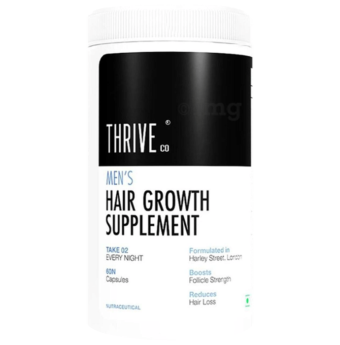 ThriveCo Men's Hair Growth Supplement Capsule is formulated with a combination of botanical extracts, essential vitamins, minerals, and nutrients that can help support hair health. This supplement contains brahmi, panax ginseng, ashwagandha, flaxseed, omega-3 fatty acids, curcumin, bamboo shoots, stinging nettle, zinc, and biotin, along with vitamin E, vitamin D3, and hyaluronic acid. These ingredients may help maintain hair thickness, provide nourishment to the scalp, and contribute to stronger-looking strands.