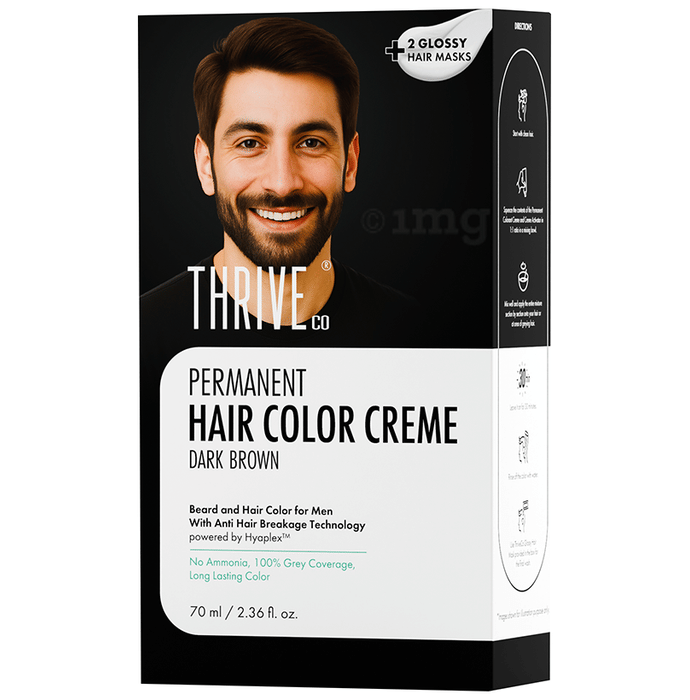 ThriveCo Permanent Hair Color Creme Dark Brown is a beard and hair colour formulation designed for men, developed with Anti Hair Breakage Technology powered by Hyaplex™. It offers grey coverage while providing a natural-looking finish. This colour creme is crafted without ammonia, making it a gentler option for colouring needs. The inclusion of Hyaplex™ technology may help strengthen hair bonds, while the added glossy hair mask can help maintain shine and softness after colouring. Its drip-free application can provide ease of use, and the formulation is designed to leave hair looking vibrant and long-lasting.