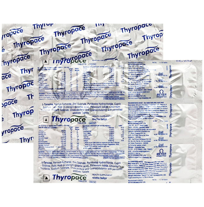 Thyropace Tablet is a rich combination of L-tyrosine, iron, zinc, vitamin B6, copper, selenium, vitamin D3 and vitamin B12. Dietary constituents have been known to affect thyroid function.
