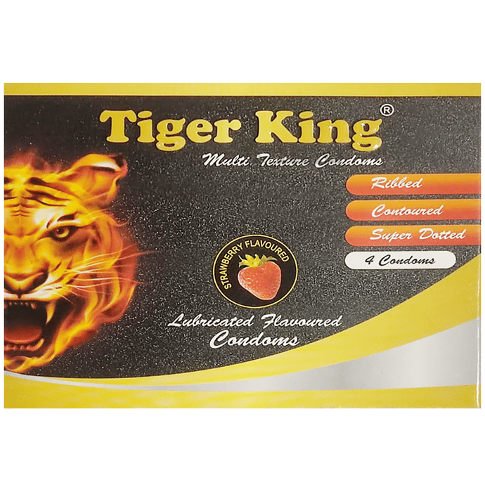 Tiger King Multi Texture Lubricated Flavoured Condom Strawberry are designed for those seeking varied sensations and intimate exploration. This 4-condom pack combines multiple surface textures—including ribbed, contoured, and super dotted—for a layered sensory experience. The condoms are lubricated and infused with a strawberry flavour to add an aromatic and enjoyable touch to intimacy. Made from natural rubber latex and electronically tested for quality, they offer a snug and comfortable fit.